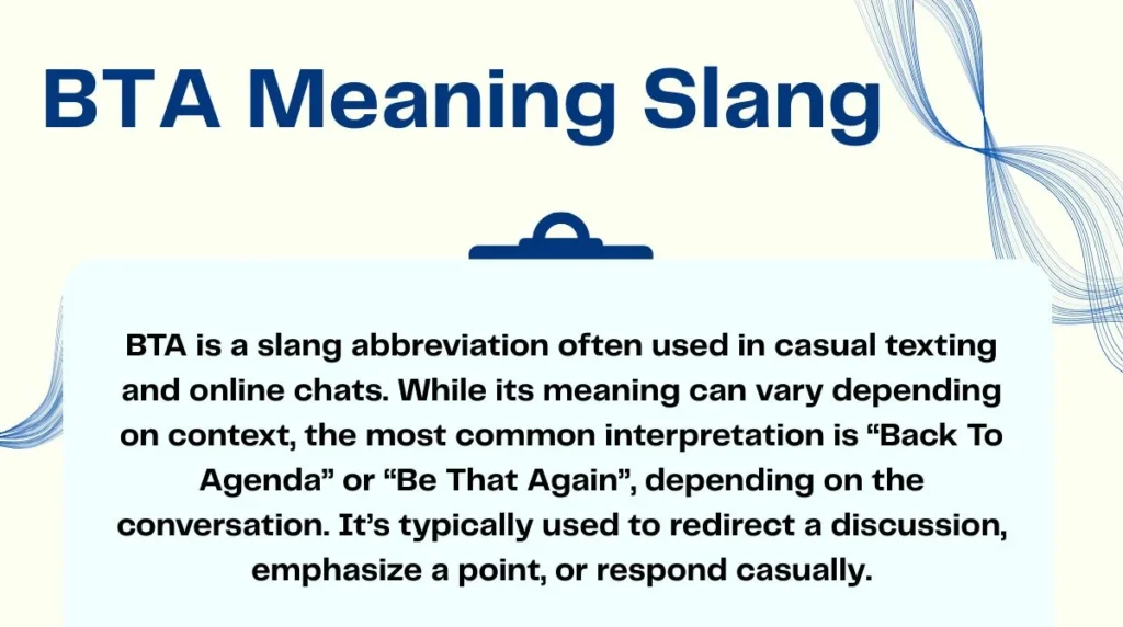BTA is a slang abbreviation often used in casual texting and online chats. While its meaning can vary depending on context, the most common interpretation is “Back To Agenda” or “Be That Again”, depending on the conversation. It’s typically used to redirect a discussion, emphasize a point, or respond casually.